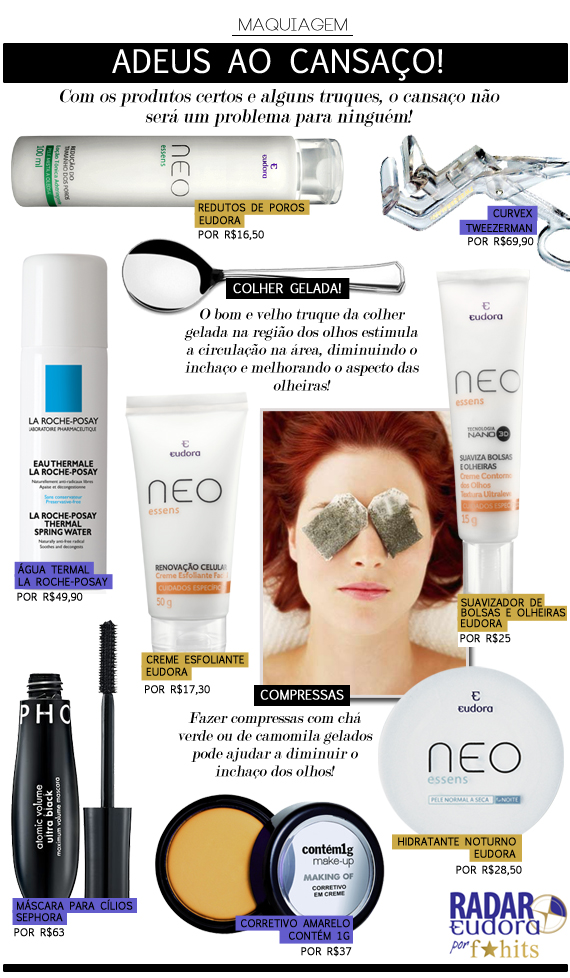 Mesmo utilizando artifícios culinários para a beauté, há sempre aquela olheira que parece que grudou e não quer sair nunca mais!! Aplicar um creme específico, como o Creme Para Contorno dos Olhos da Eudora, que suaviza bolsas e olheiras, salva qualquer um… E se for para apagar mesmo, com um resultado ainda mais legal, corretivo nelas! O Amarelo da Contém 1g é demais (lembram daquele post sobre corretivos e olheiras? Lá falo sobre os coloridos!) e completa o serviço. Vale levantar o olhar com um curvex e uma boa máscara de cílios (melhor combo de make up que já existiu), porque ninguém quer sair por aí com cara de peixe morto! hahaha