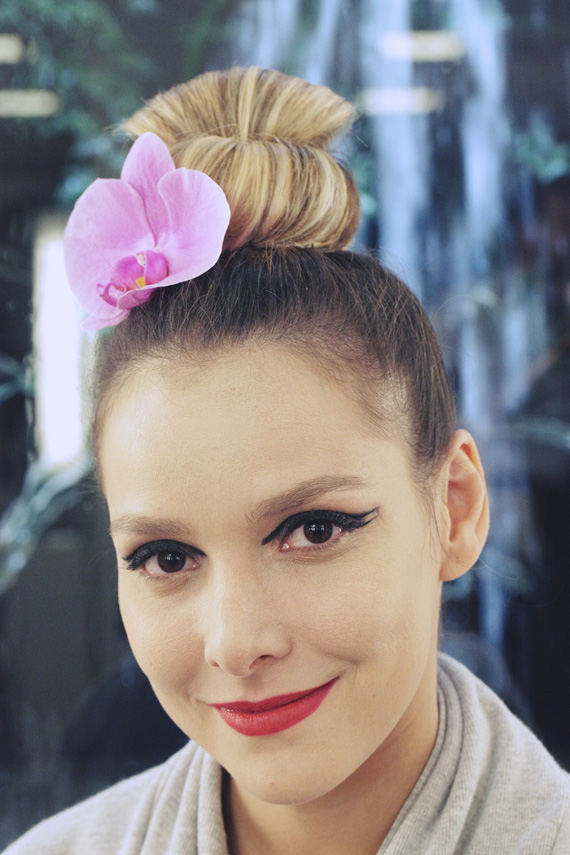 Yasmine Sterea, editora de moda da Vogue, tava de japa! Make brancona com destaque pra boca e olhos. AMEI o coque com flor…