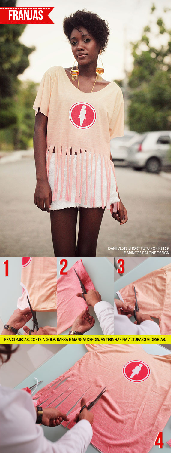 Pensei em modelos mais simples, que possam ser customizados apenas com tesoura, no máximo linha e agulha pra dar uns pontinhos, mas nada de outro mundo! Além disso, minha dica pra coordenar as peças é justamente IGNORAR o abadá e montar os looks ao redor dele, o danado não vai combinar com nada mesmo, relaxa! kkkk