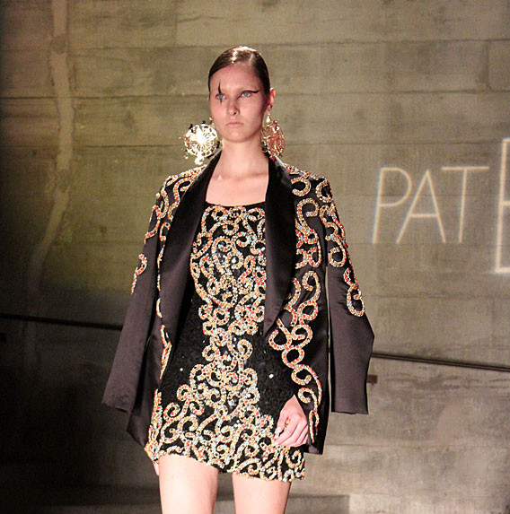 Logo em seguida a música animou e a Pat Bo entrou na passarela em clima circense! Podem esperar muito couro (preto e azul!), alfaiataria com toques dândi, shortinhos INCRÍVEIS, bordados formando arabescos (os de pedraria colorida são um show!) e muito pink!