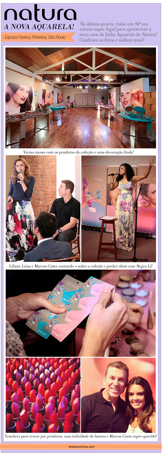 Quem me acompanha no insta (se ainda não segue corre lá, @sthefanypassos !) viu que ontem dei um pulinho em São Paulo a convite da Natura para conferir a nova cara da Aquarela, que veio com uma nova “roupagem”, com embalagens lindas (achei mais elegante!) e mais sustentáveis (mais refis e menos plástico!). Mais adequadas aos dias de hoje, sabe? E o evento de apresentação foi uma delícia! Primeiro, rolou um bate-papo com Liliane Lima, gerente de marketing de maquiagem da Natura, e Marcos Costa, maquiador, que nos explicaram um pouquinho sobre as novidades, além de mostrar dados sobre o mercado brasileiro. Depois, a melhor parte: fomos conhecer as novidades de perto!