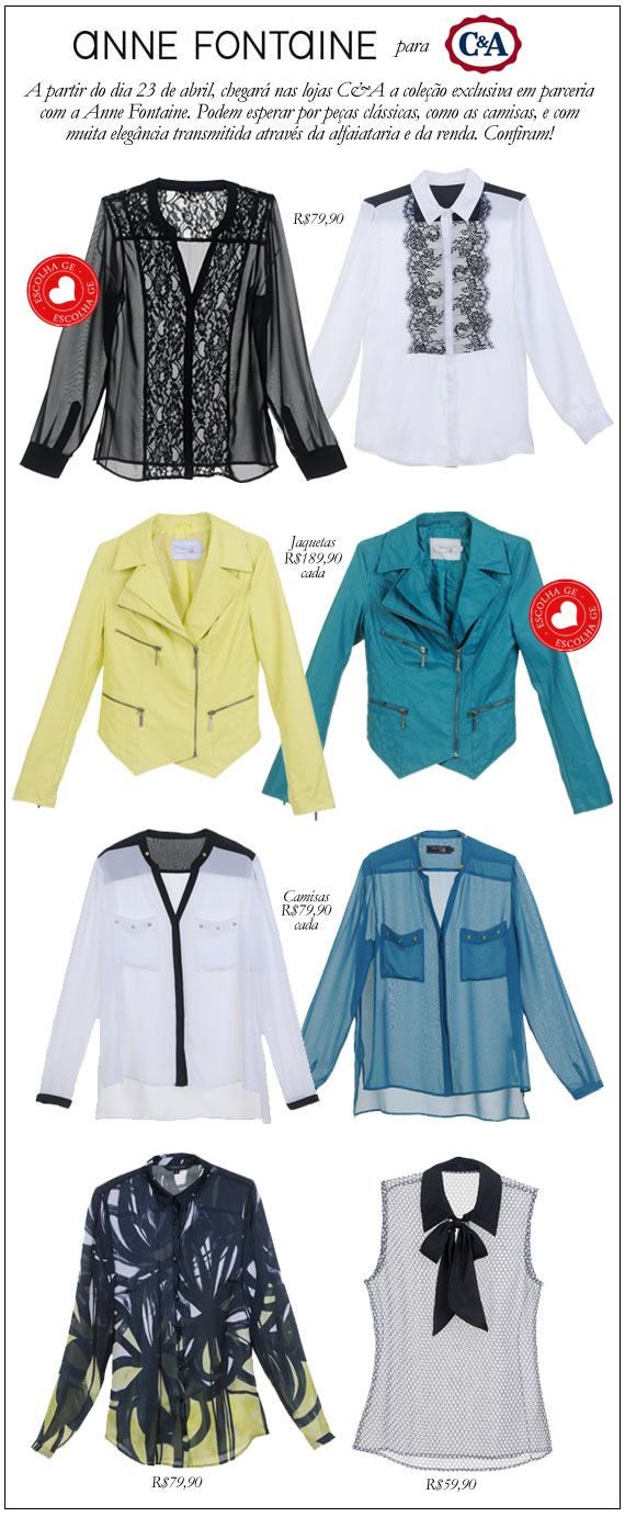 Depois de começar 2013 lançando um tsunami de collections assinadas (Carina Duek, 284, Santa Lolla, Ágatha, Isabella Giobbi…ufas!), a C&A apresenta mais uma parceria, desta vez com um nome internacional, mas não tão conhecido do grande público. Anne Fontaine é uma estilista brasileira radicada em Paris, que comanda uma marca especializada em alfaiataria e tem a nossa amada camisa branca como principal hit!