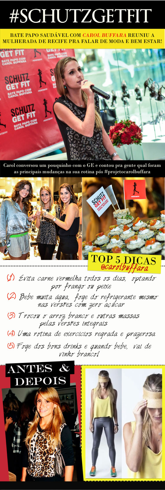 Nessa última quarta-feira (17) aconteceu aqui em Recife, na Schutz do Shopping Rio Mar, um bate papo super bacana com a fashionista e musa carioca do fitness Carol Buffara, que bomba no insta com mais uma hashtag saudável: o #projetocarolbuffara! Isso mesmo, Carol veio ao Recife contar um pouquinho sobre o seu estilo de vida “verde”, que vem inspirando muita gente a entrar em forma. O bate papo foi longo, a mulherada tietou mesmo e aproveitou pra tirar todas as dúvidas com a moça. O menu, como não poderia ser diferente, foi super light: açaí, barrinhas de cereal, sanduíches light etc.