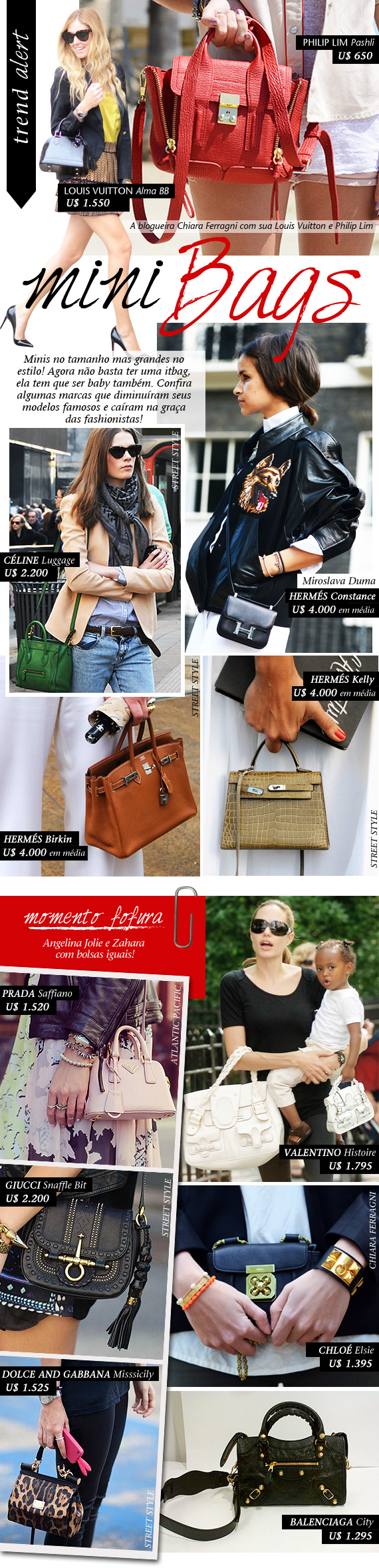“Querida, encolhi as itbéguis!” kkkk Esse poderia ser o título desse post, mas a blogueira aqui teve um pouco senso crítico para piadas sem graça e manteve o “trend alert” de sempre. Brincadeiras a parte, depois da tendência das bolsas menores, muitas de levar a tiracolo, notei que marcas de luxo como Balenciaga, Gucci, Prada e até Hermés, andam reproduzindo alguns de seus modelos mais famosos em tamanho mini – alguns micro meeesmo, olha essa Kelly da montagem, parece de boneca né?