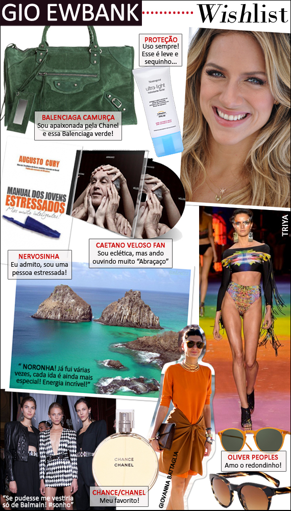 Eu ainda assistia Malhação (escondida, vale ressaltar!) quando Gio Ewbank estreou na Globo. Lembro super do trio belíssimo: Gio, Thaila e Fiorella, concorrência desigual com as pobres adolescentes da vida real! kkkk Pouca gente sabe, mas a escolhida do “Wishlist” de hoje fez faculdade de moda, chegou a ter uma marca própria chamada “As Filhas”, um ecommerce (o ModaIt) e sempre viveu nesse meio por conta da mãe, que foi designer têxtil e hoje é produtora de moda. Nada mais natural que seus looks fossem super inspiradores certo?